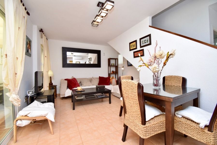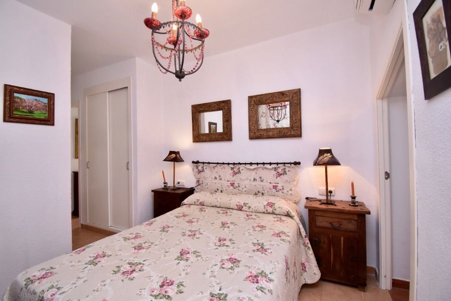 The house has 3 bedrooms and 2 bathrooms, spread over 2 levels. The accommodation offers a lawned garden with trees and a lawned communal garden with trees. The vicinity of the beach, shops, sports activities, nightlife, sights and culture makes this a fine house to spend your holidays in Spain with family or friends.