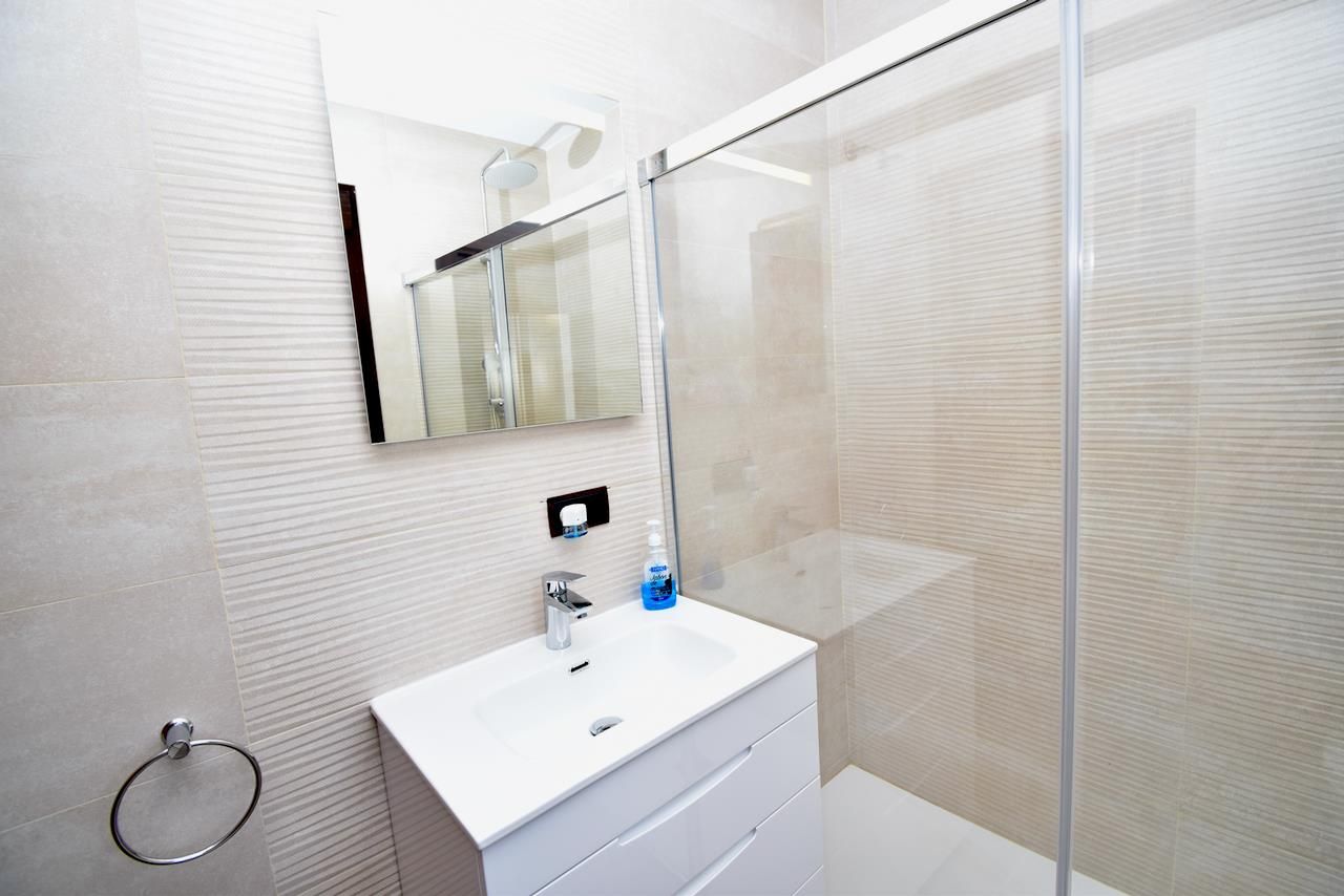 • bathroom with single washbasin, shower and toilet