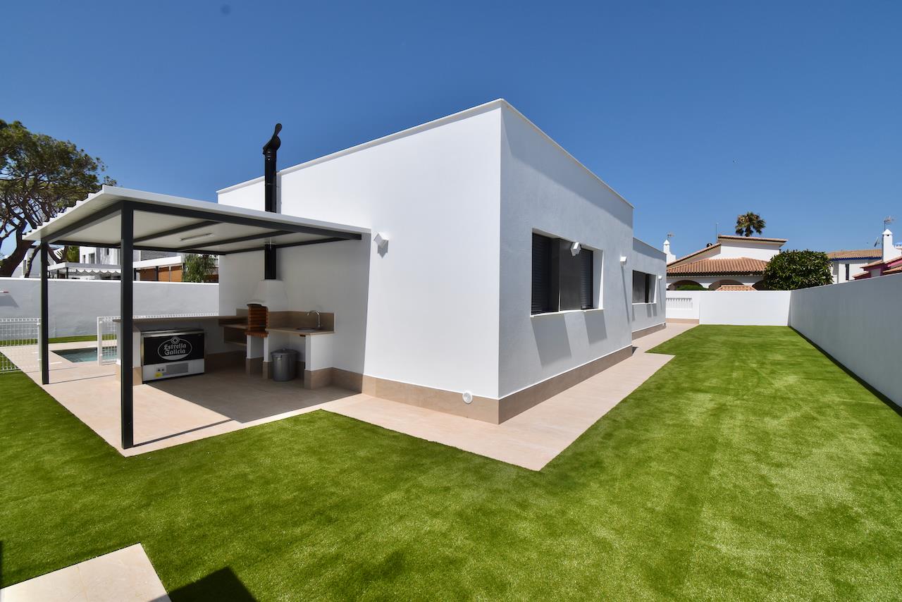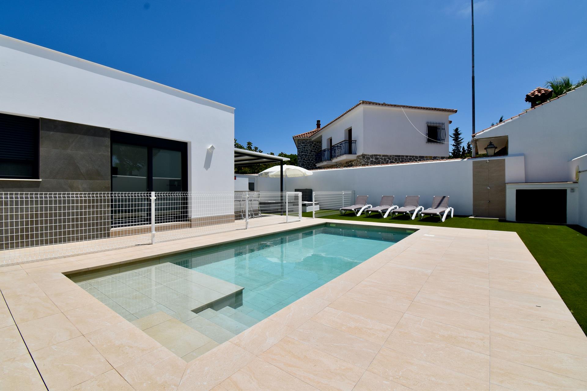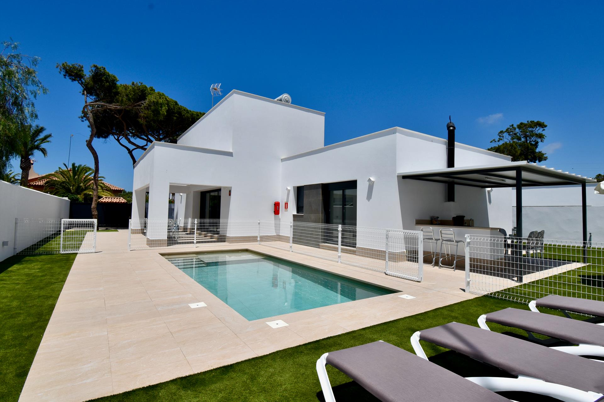 Modern and luxurious villa with private pool in Chiclana de la Frontera, Costa de la Luz, Spain for 8 persons. The house is situated in a residential beach area and is 1 km from La Barrosa beach.