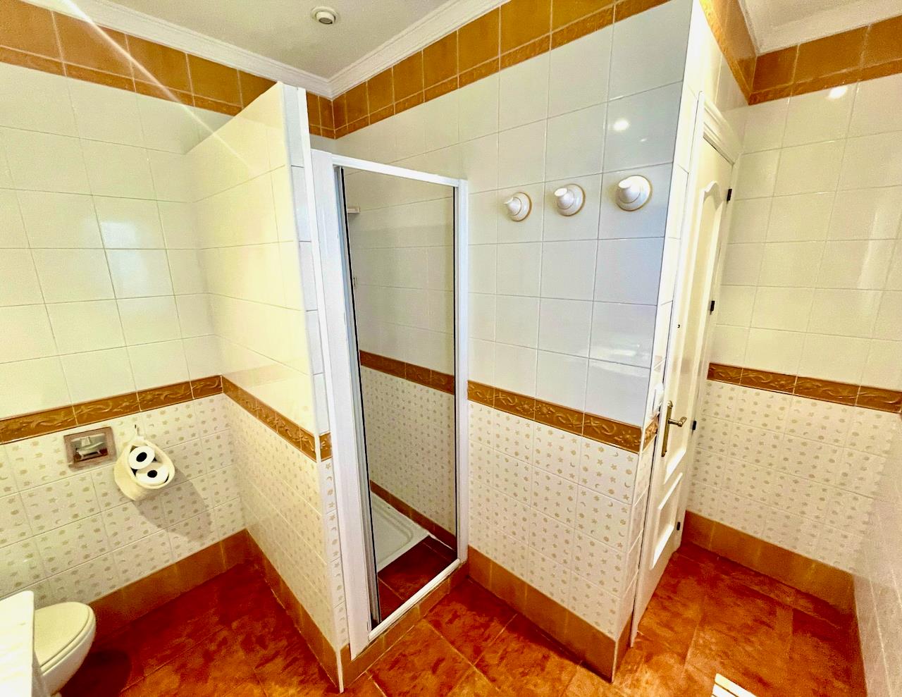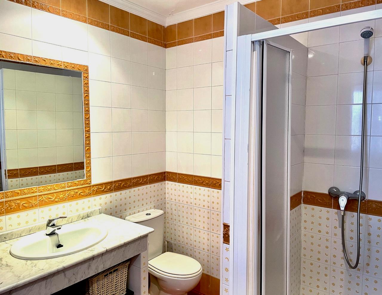 • bathroom with single washbasin, shower and toilet