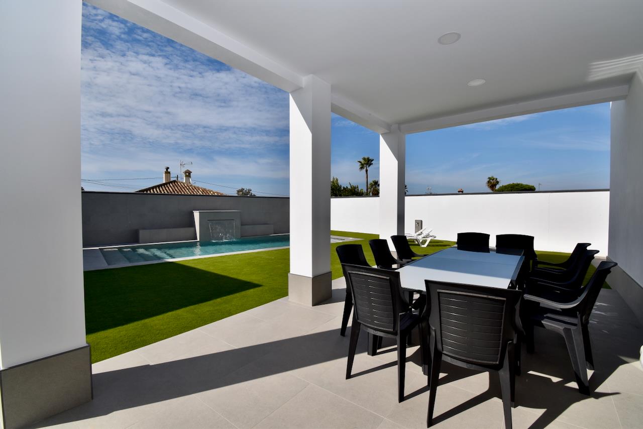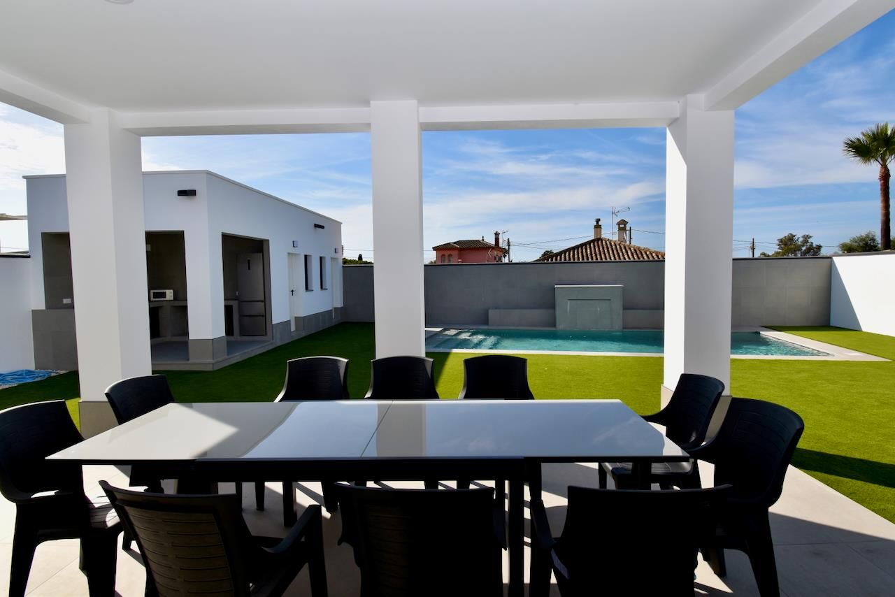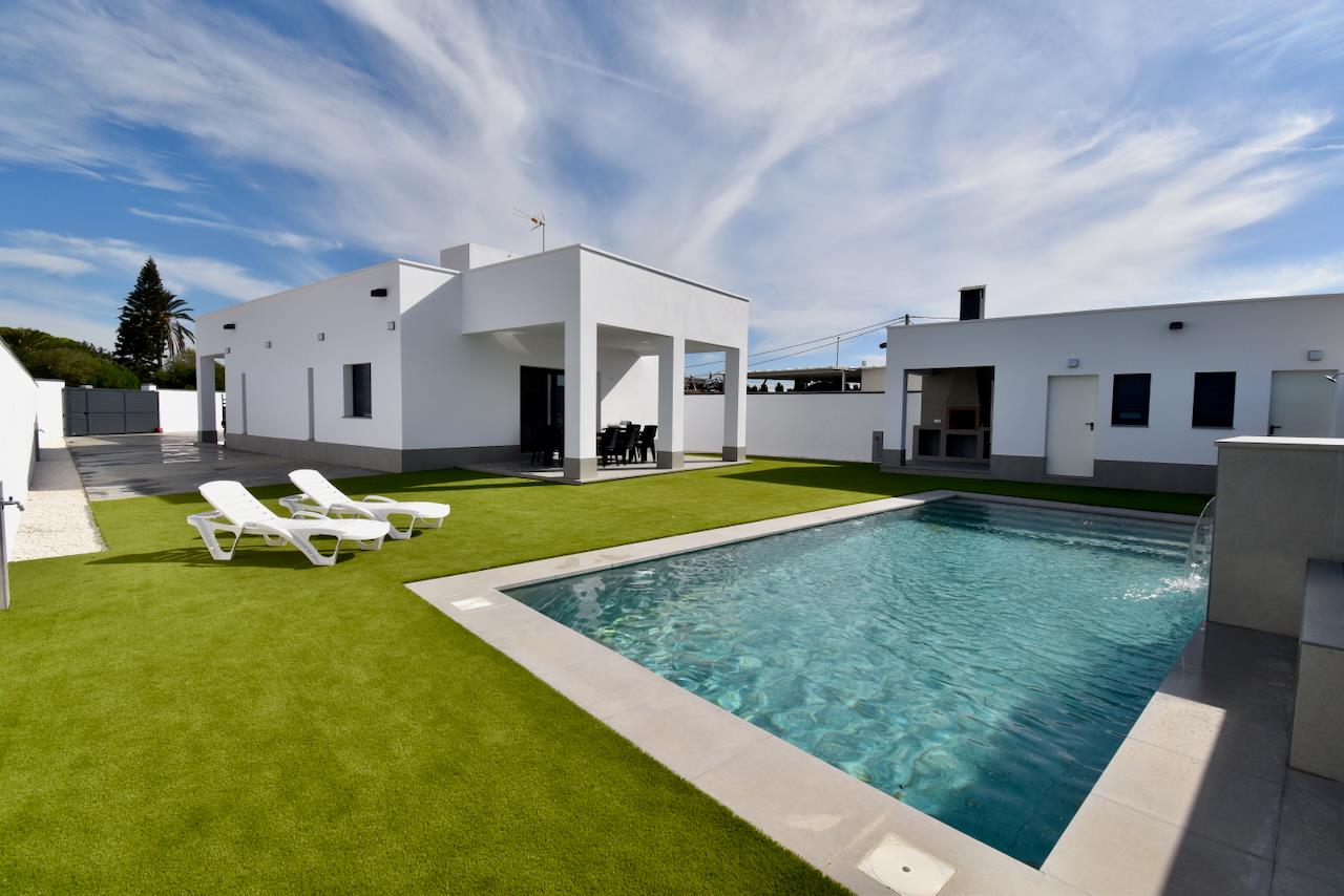 Modern and luxurious villa with private pool in Chiclana de la Frontera, Costa de la Luz, Spain for 12 persons. The house is situated in a rural beach area and is 4 km from Chiclana.